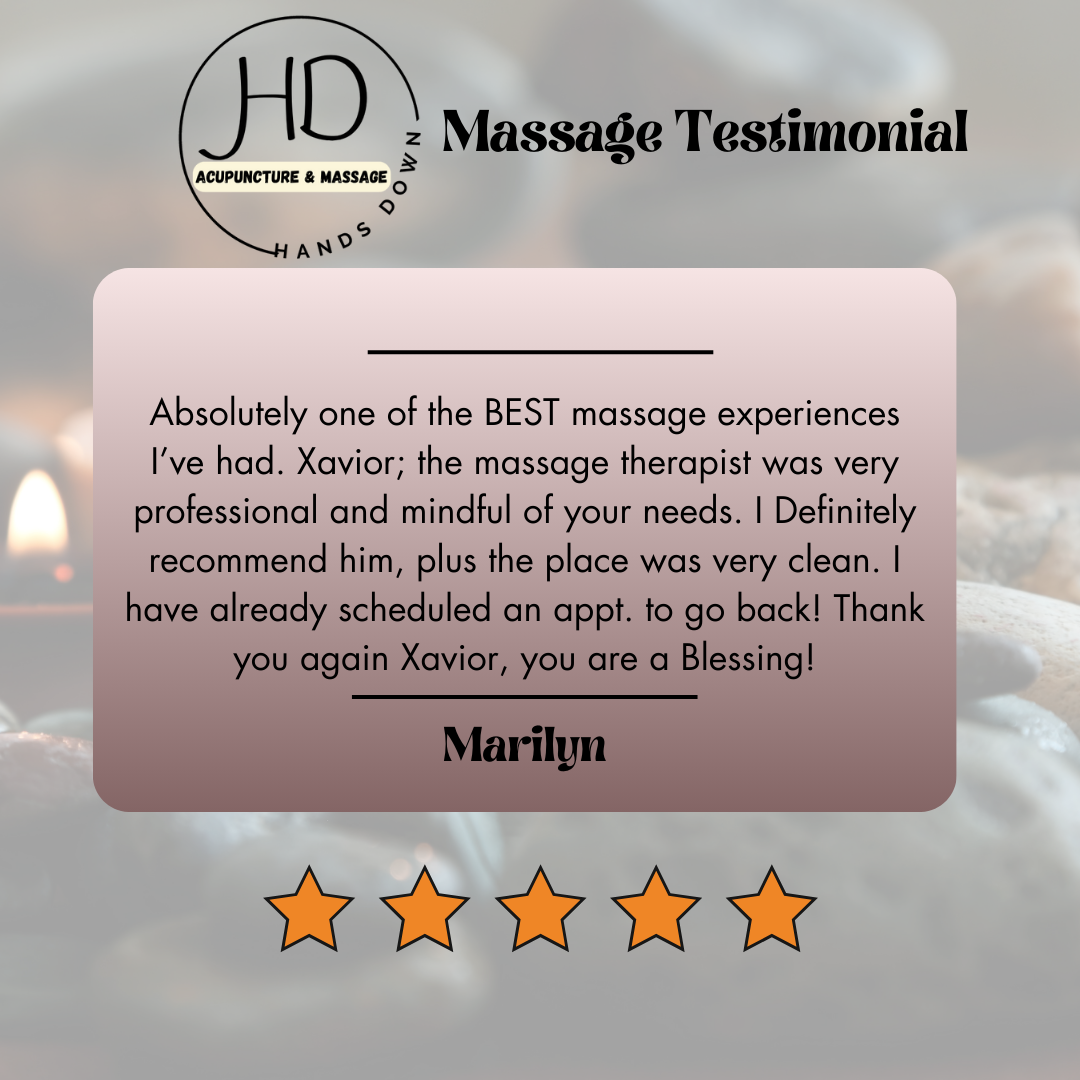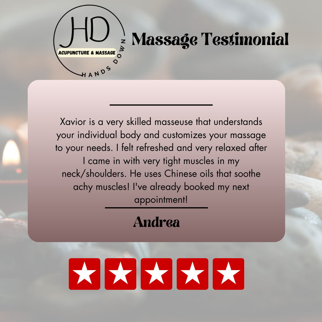 "Xavier’s massage is so pleasant and he knows the body well if you need a little medicinal work he knows how to get the job done and the relaxing atmosphere is an added plus. I highly recommend hands down." - Cheryl